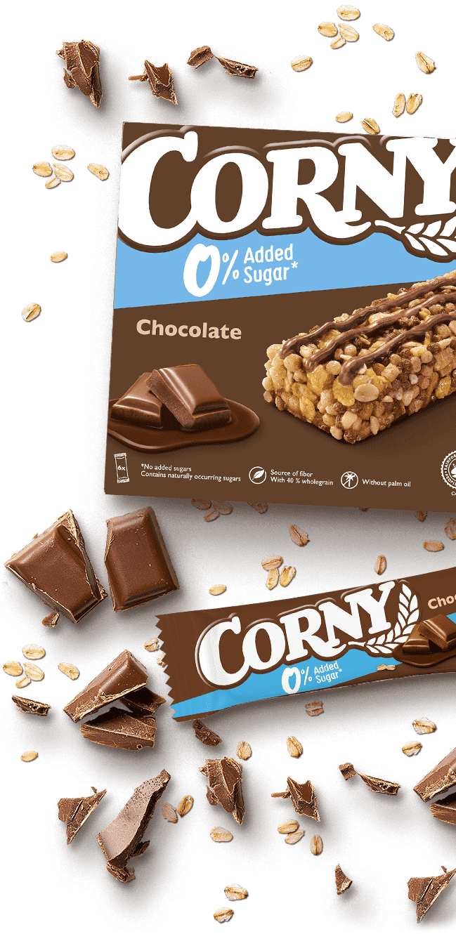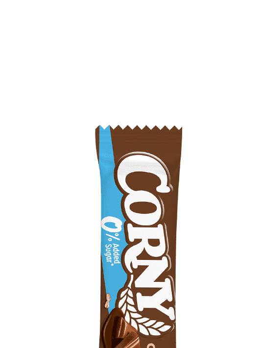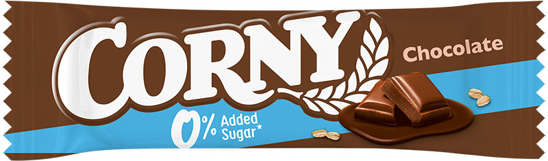 Ingen skal gå ned på snacks. Heller ikke selvom man ønsker at undgå rafineret sukker. Derfor har vi lavet Corny 0% Added Sugar* Chocolate med 40 % fuldkorn og ingen tilsat sukker*. Kommer i en praktisk multipak, der indeholder seks individuelt indpakkede mindre barer.