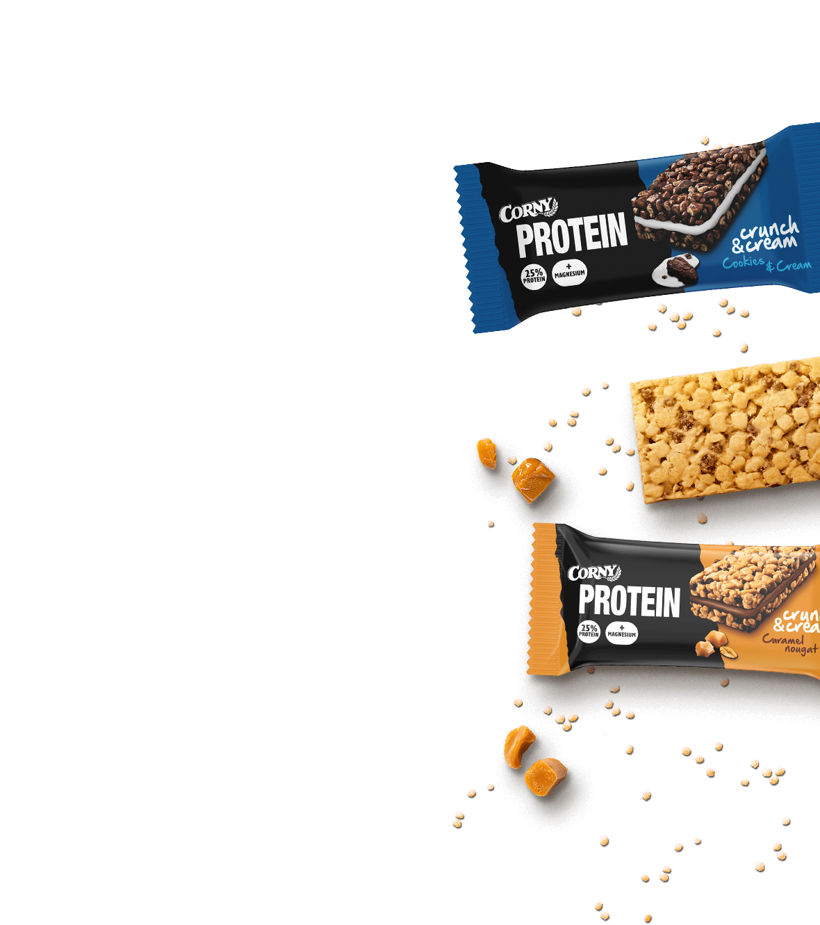 Prøv den nye Corny Crunch & Cream Caramel Nougat, en super velsmagende proteinbar i tre lag. Uimodståelige sprøde krispies kombineret med et cremet karamel- og nougatfyld er en uovertruffen kombination.