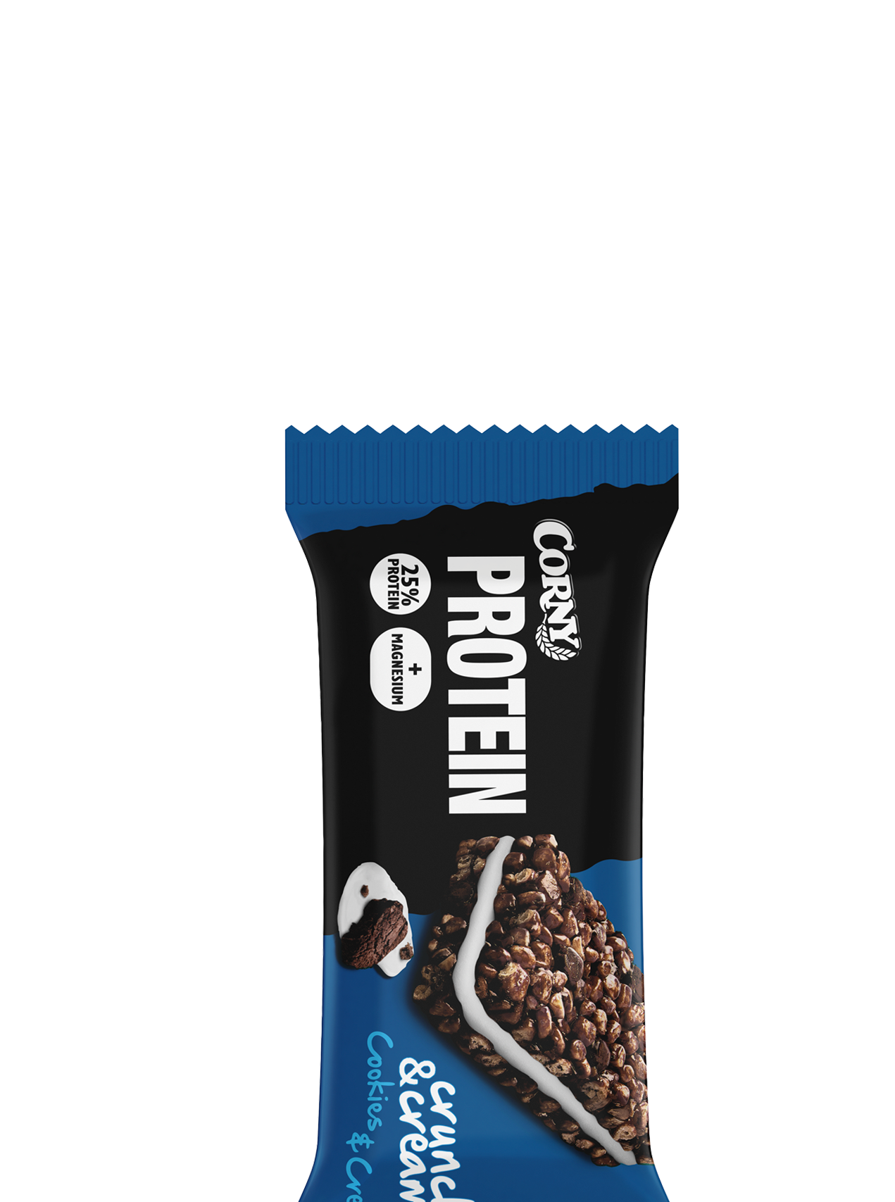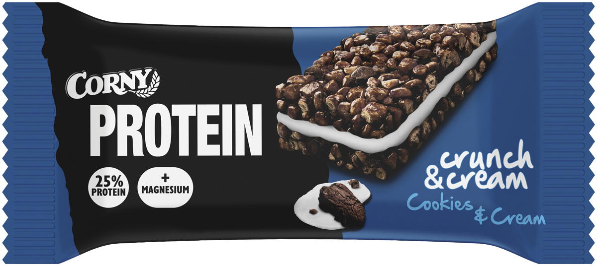 Corny Crunch & Cream Cookies & Cream er en super velsmagende proteinbar i tre lag. Sprøde krispies, stykker af chokoladecookies og blød vaniljeglasur er en uimodståelig kombination! Hver bar indeholder 25 % protein og er desuden beriget med magnesium, som bidrager til normal muskelfunktion. En perfekt snack eller mellemmåltid når du er ”on-the-go” og har brug for noget ekstra protein.